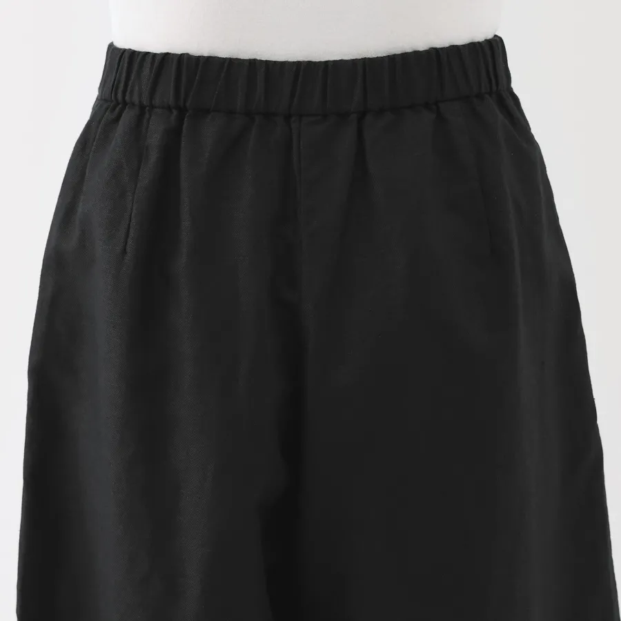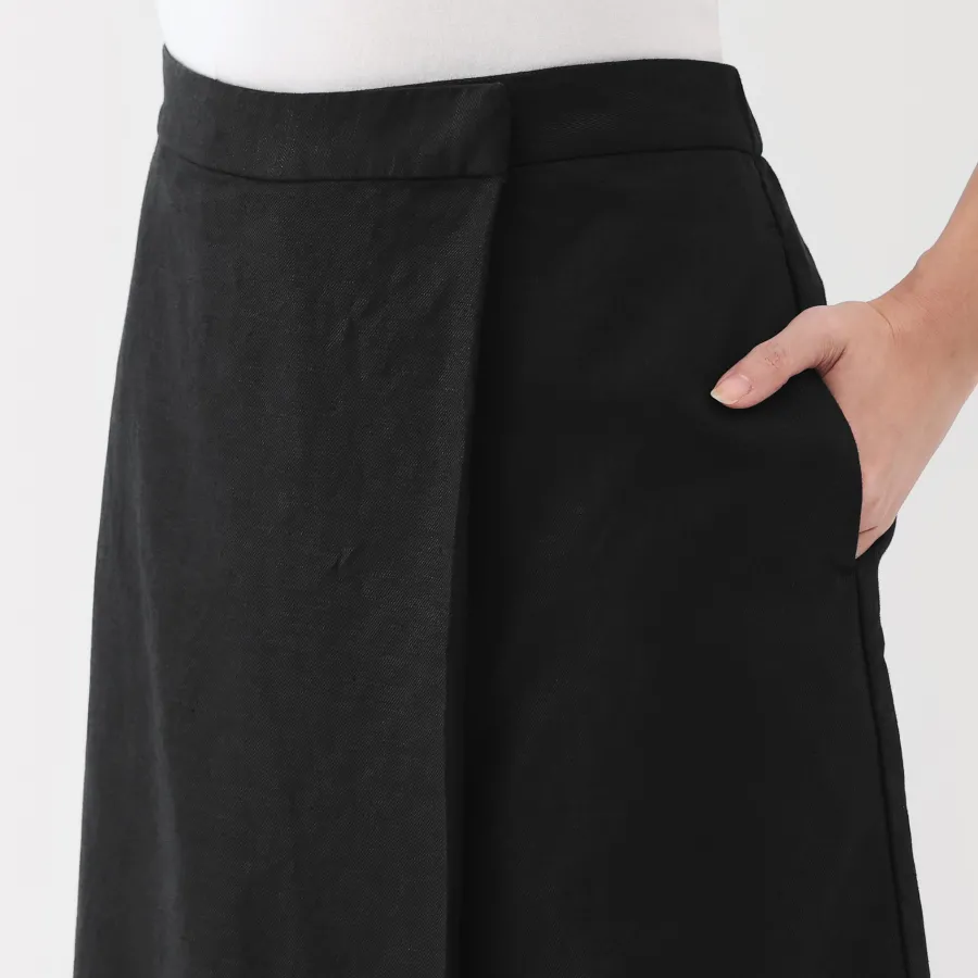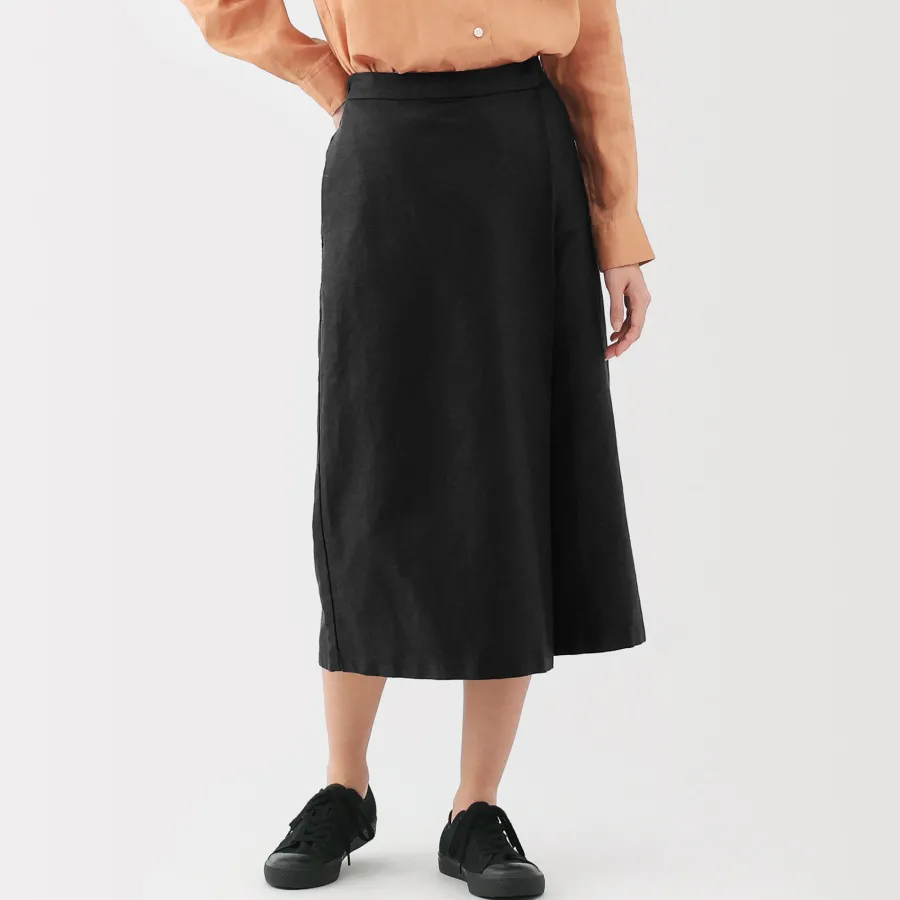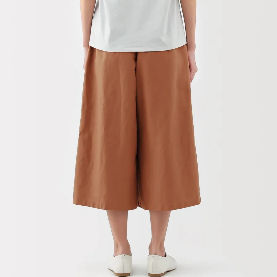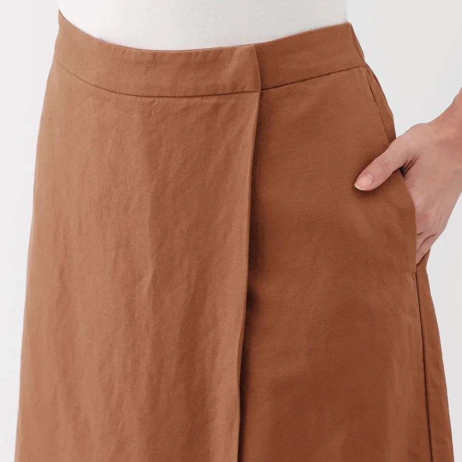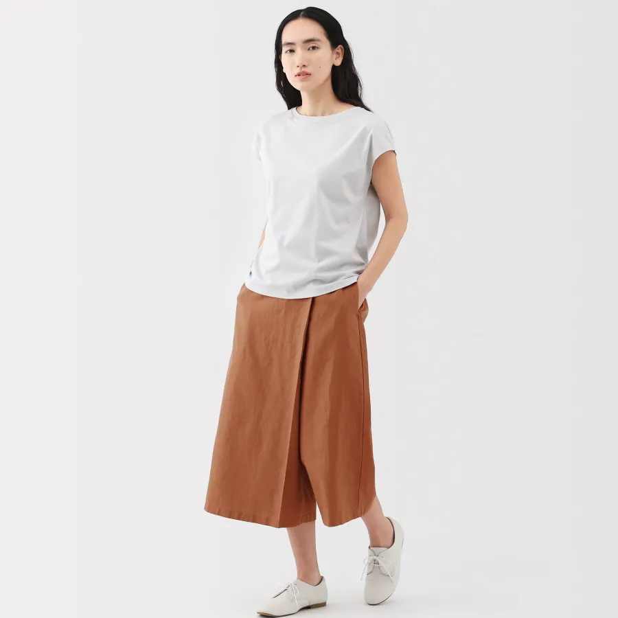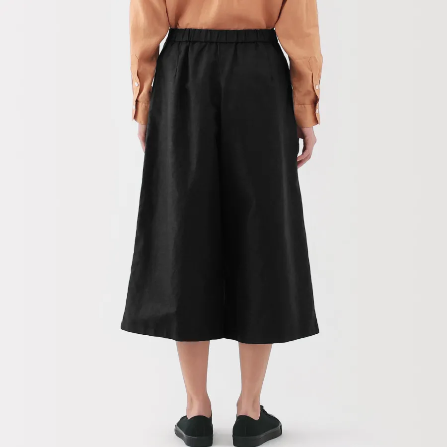 Experience all-day comfort in these wide trousers, crafted from a smooth organic cotton and hemp with a textured feel. They are designed to resemble a wraparound skirt, making them both stylish and comfortable.