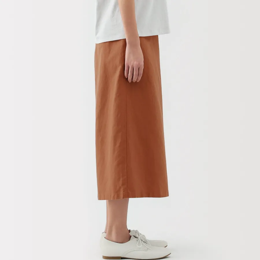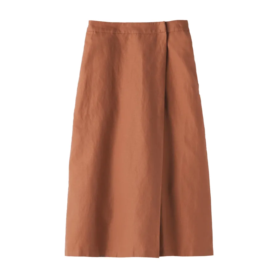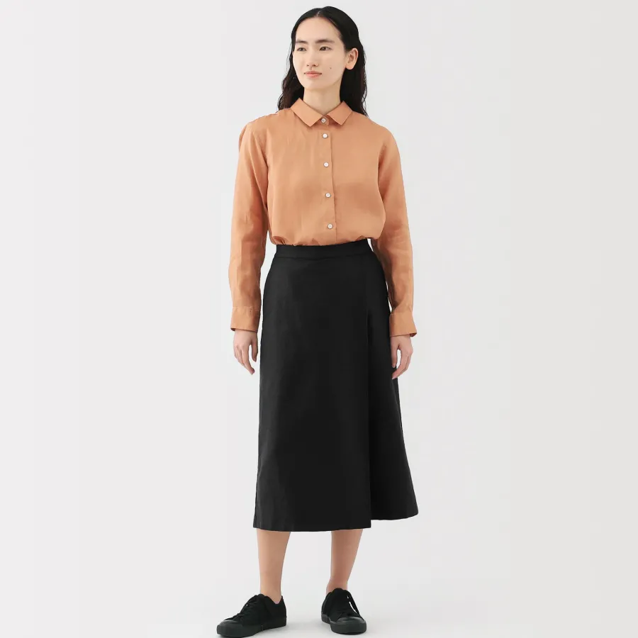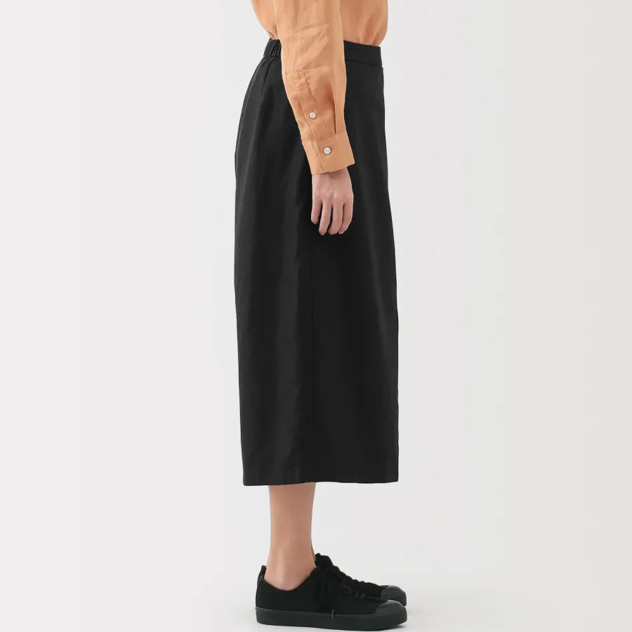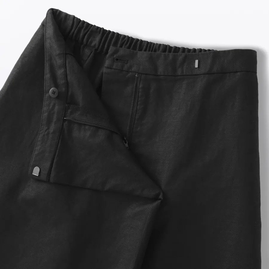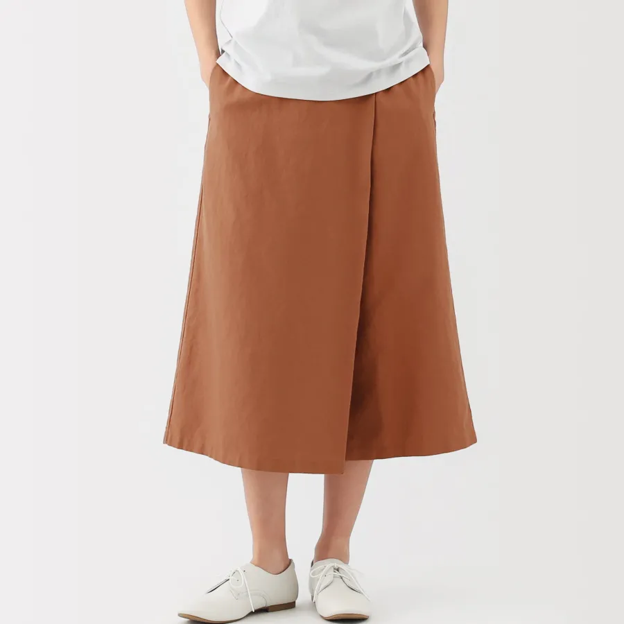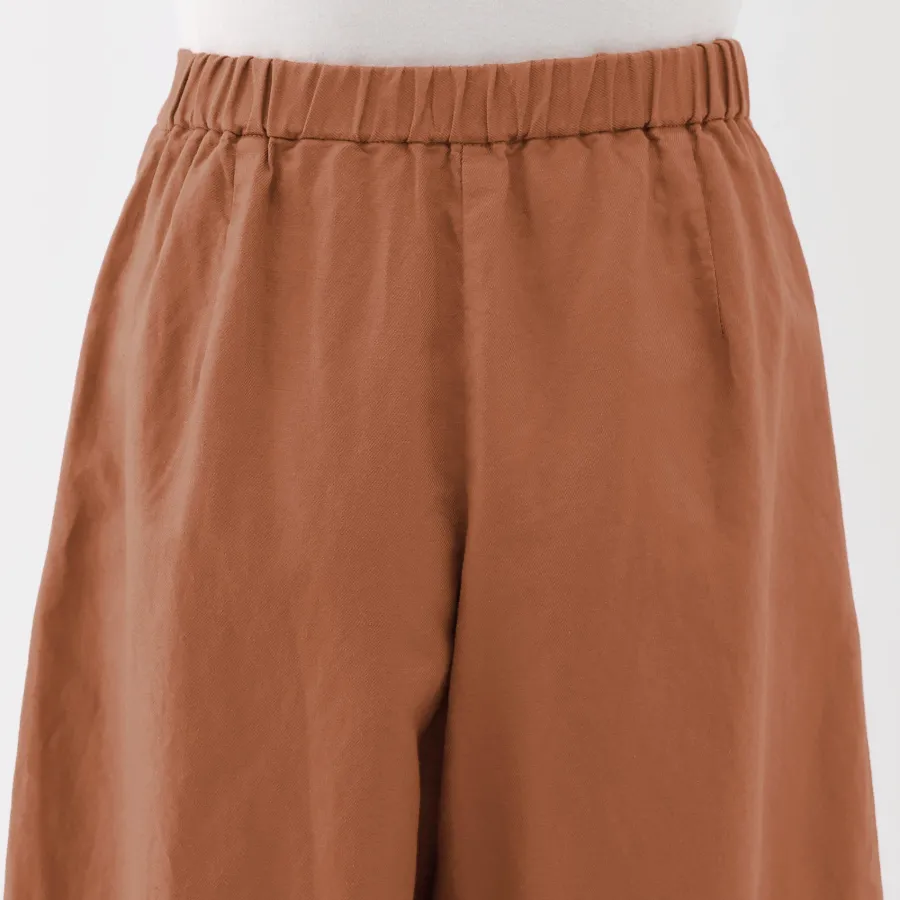 Experience all-day comfort in these wide trousers, crafted from a smooth organic cotton and hemp with a textured feel. They are designed to resemble a wraparound skirt, making them both stylish and comfortable.